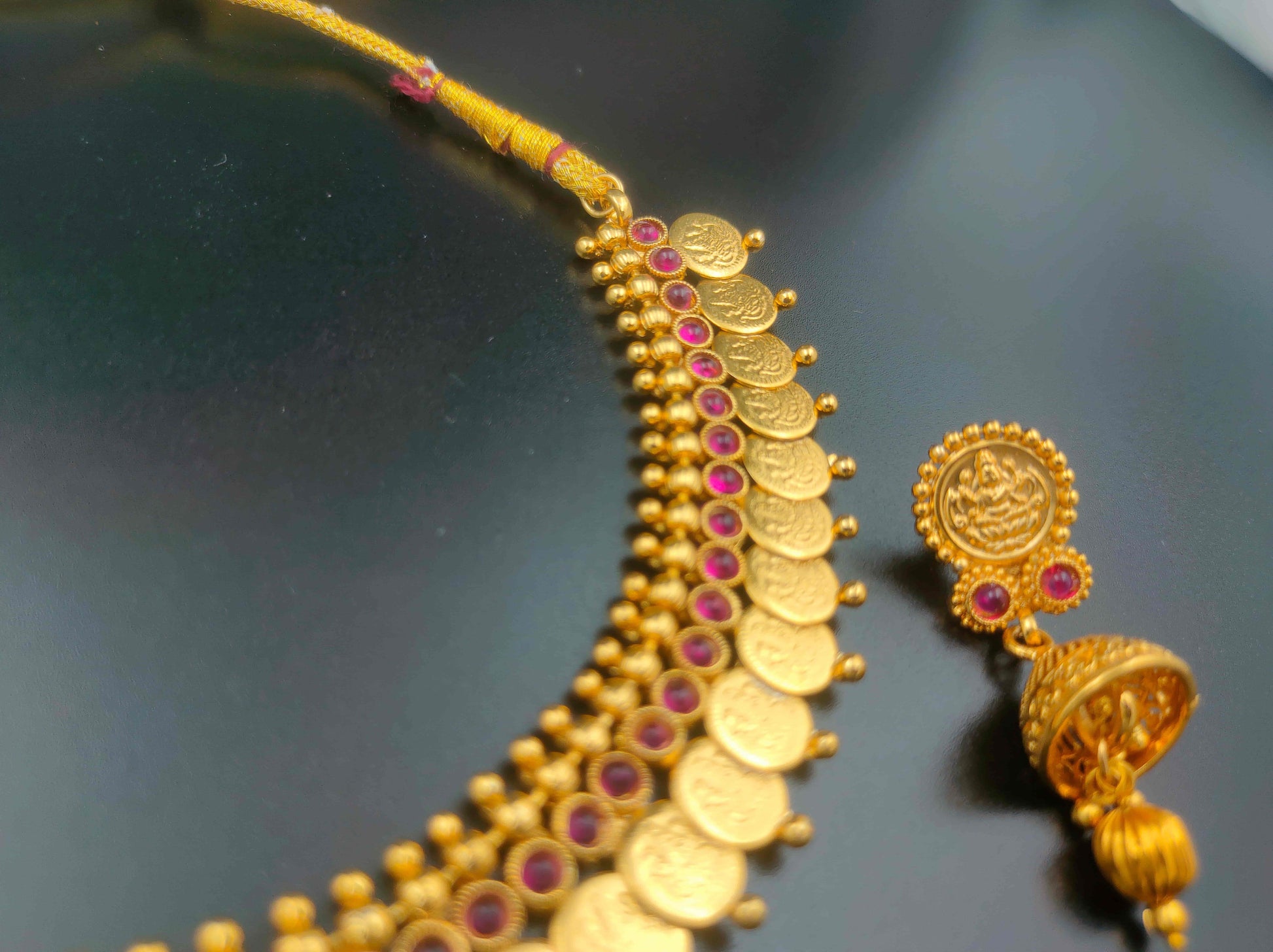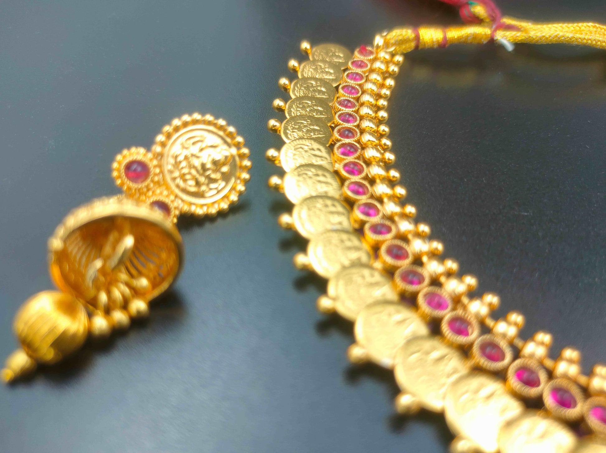 Celebrate timeless tradition with our Devi Kanaka Coin Necklace Set, inspired by the opulent artistry of South Indian temple jewelry. Featuring embossed Lakshmi coin motifs and radiant ruby-toned stones, this antique gold-finish necklace set is perfect for weddings, festivals, and sacred rituals.