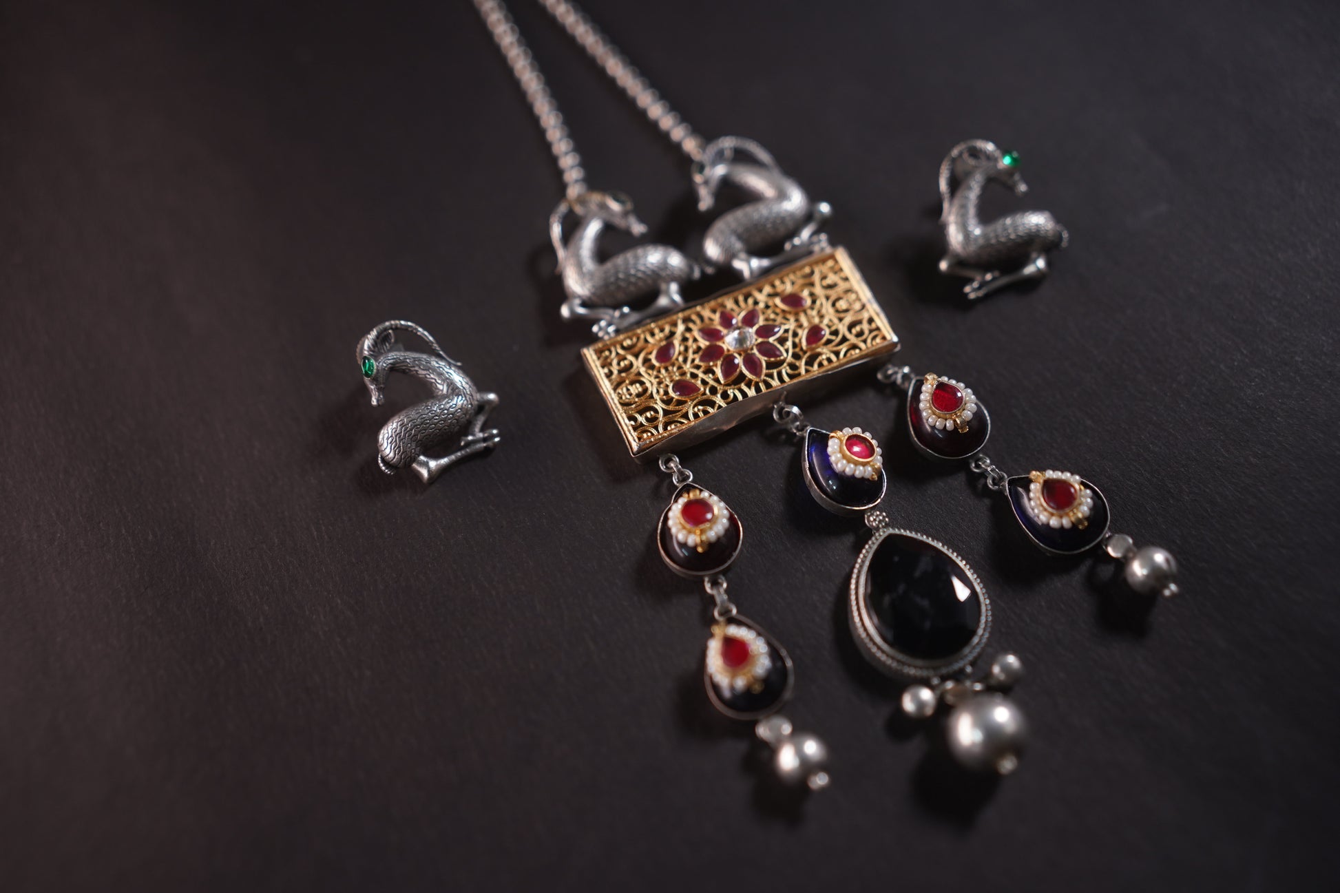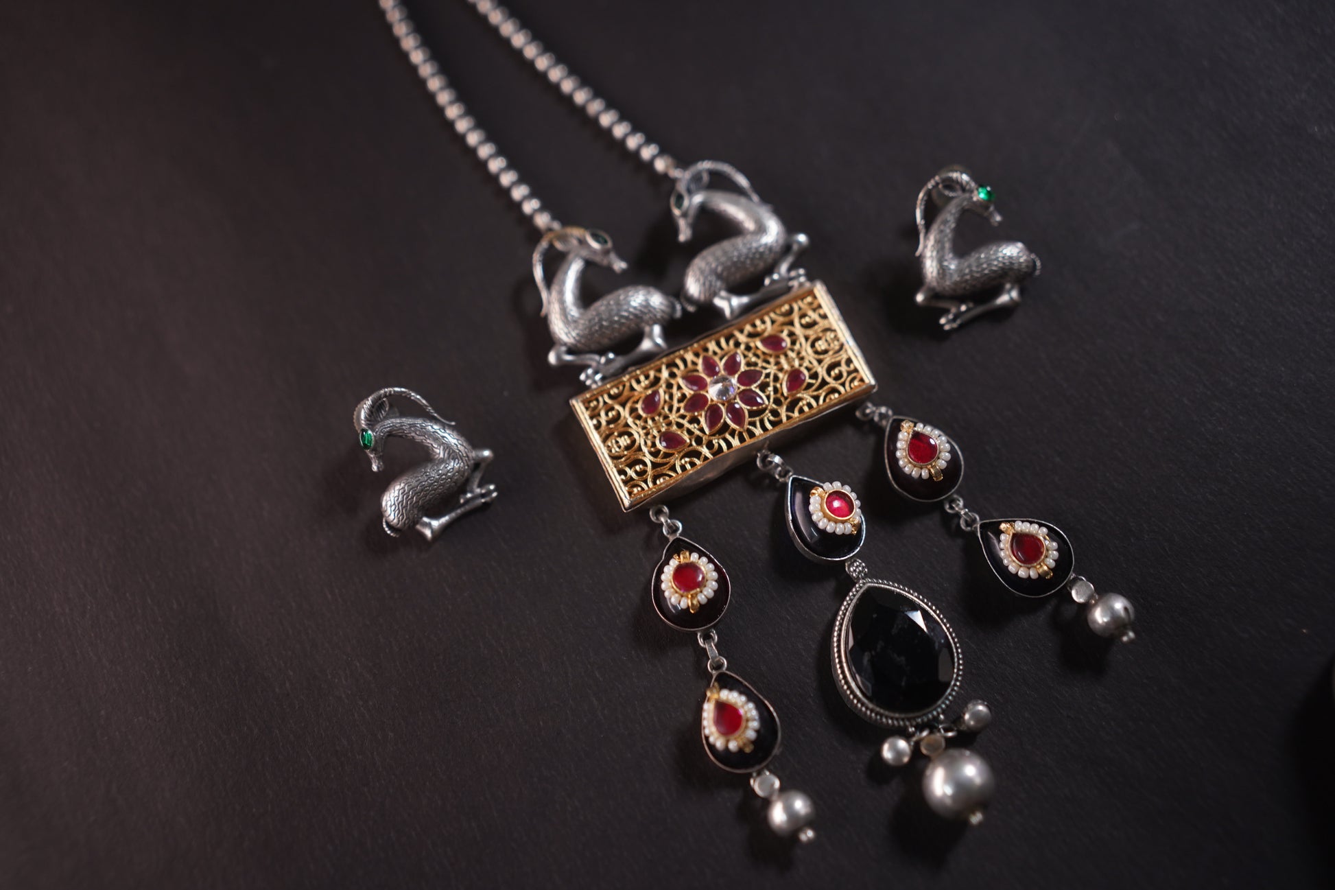 Gothica’s Hand of the Hart is a handcrafted tribute to ancient woodland folklore, where deer were symbols of purity, intuition, and untamed beauty. Adorned with delicately carved silver deer motifs, antique gold filigree, crimson kundan, and a bold black onyx teardrop, this statement necklace captures the spirit of nature’s grace entwined with gothic regality.