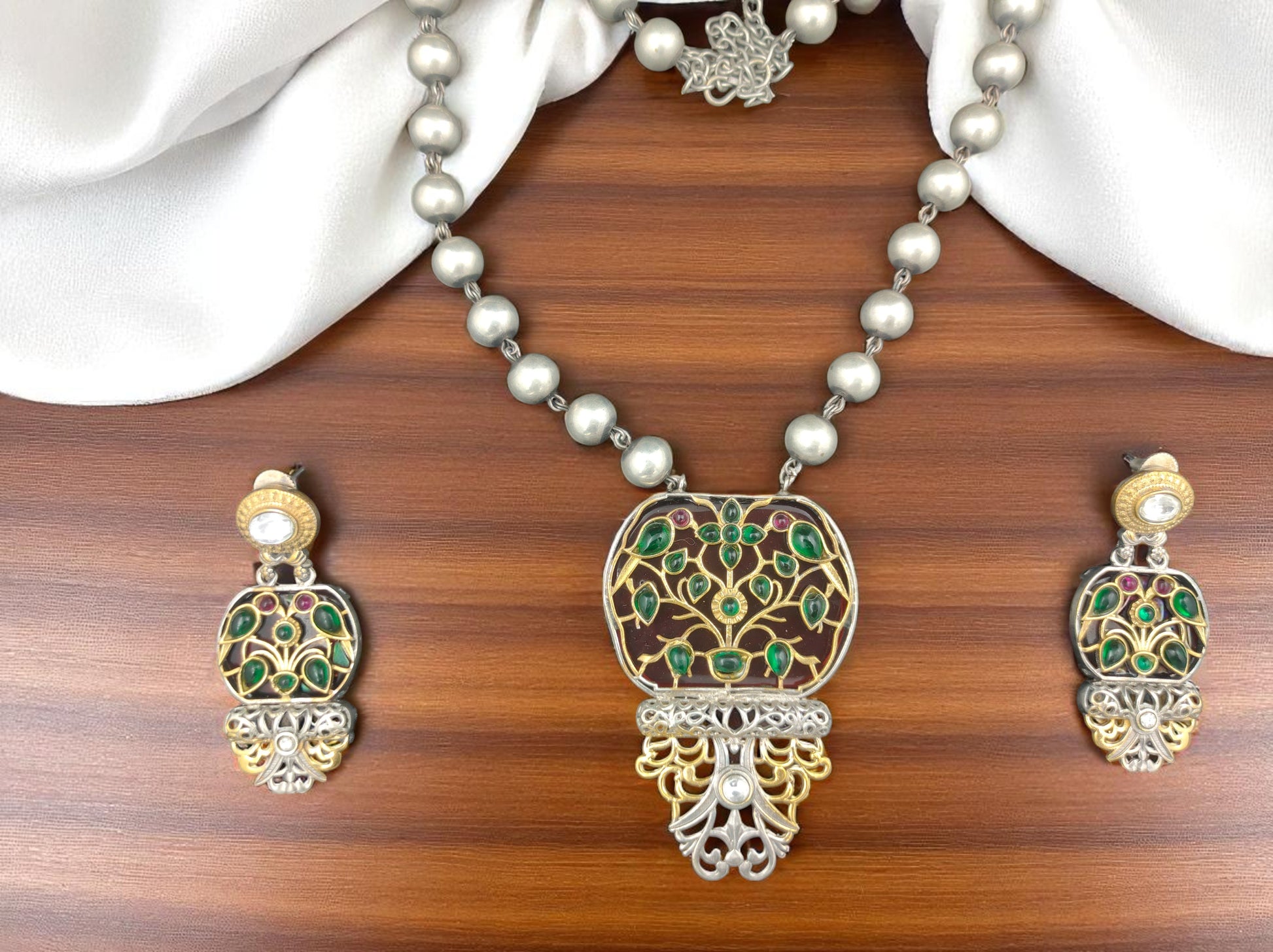 This handcrafted set features a detailed pendant with rich enamel work in emerald and ruby tones, encased in antique gold and silver accents. The pendant hangs gracefully from a string of luminous faux pearls, creating a perfect balance of traditional art and modern sophistication.