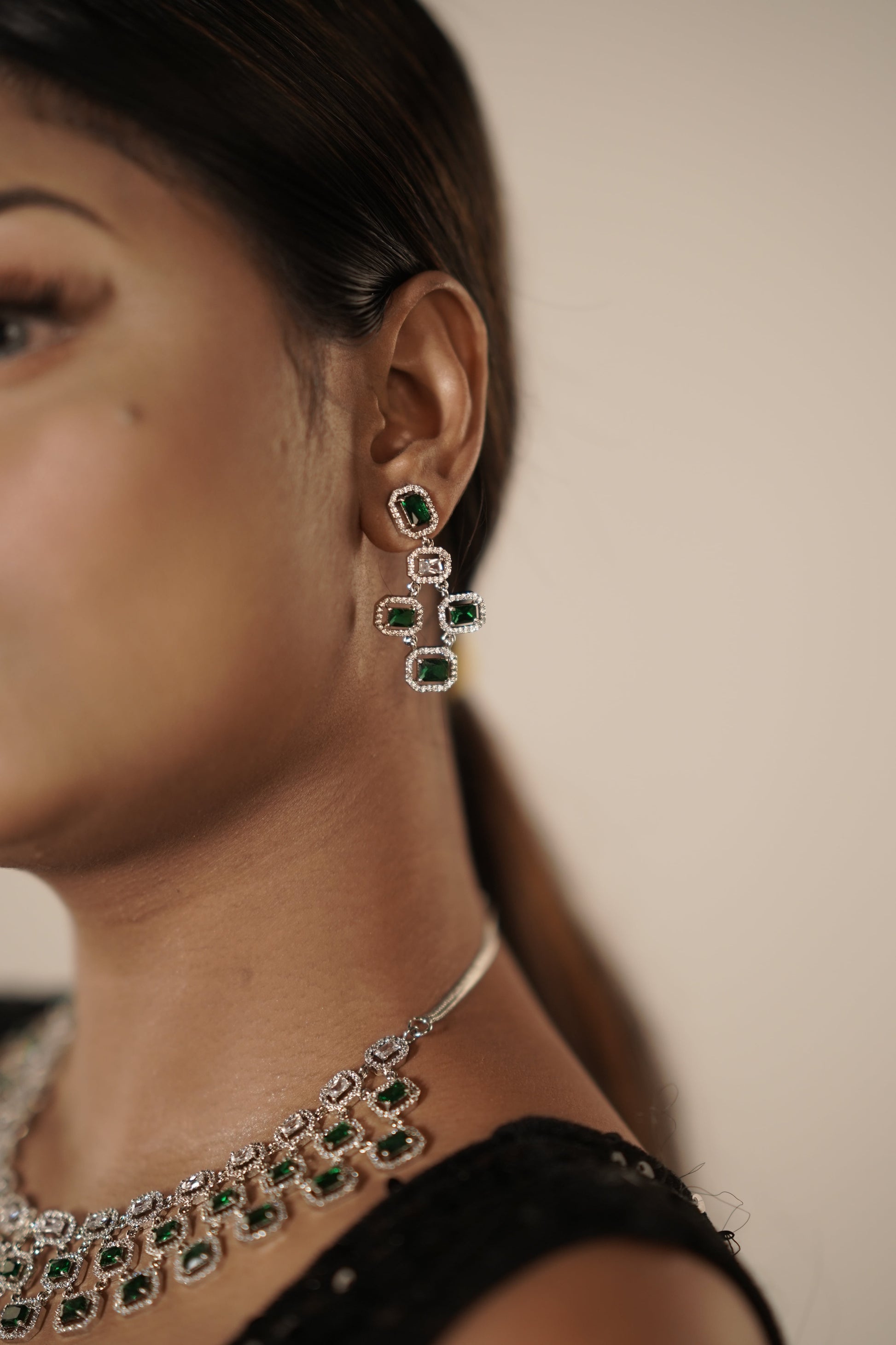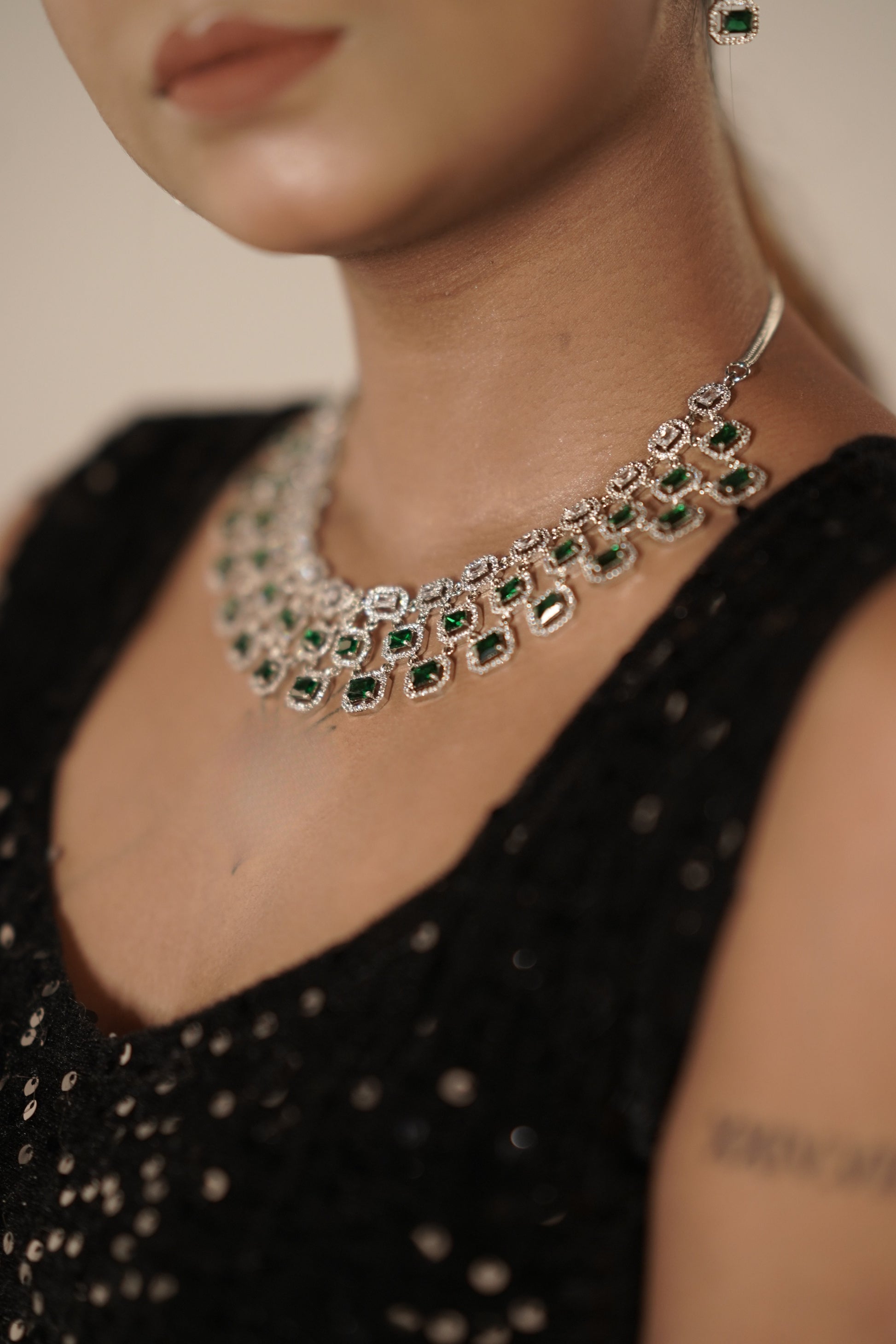 Gothica Queen Elowen Necklace set with AAA quality American Diamond stones and regal emerald green brilliance.