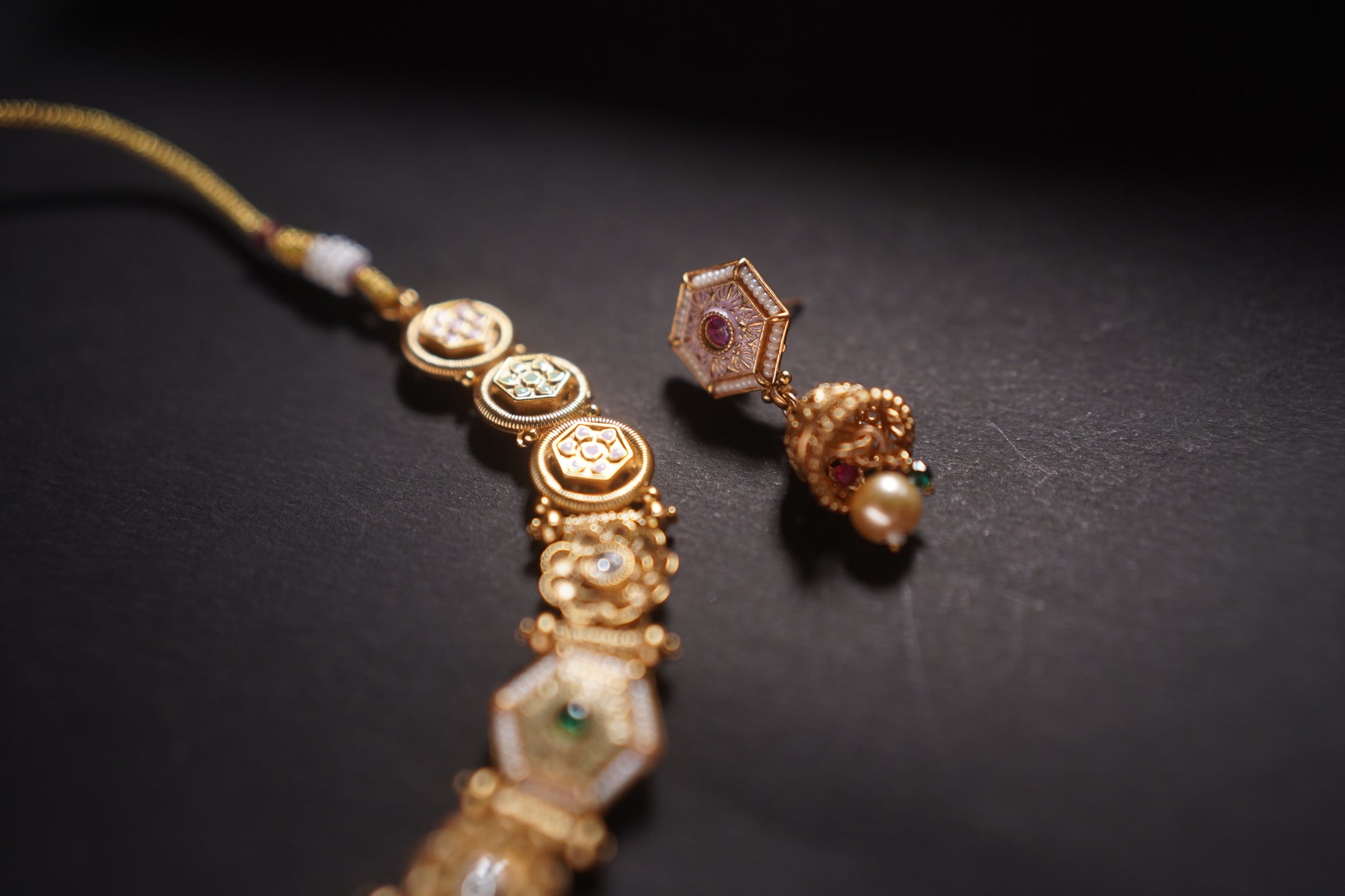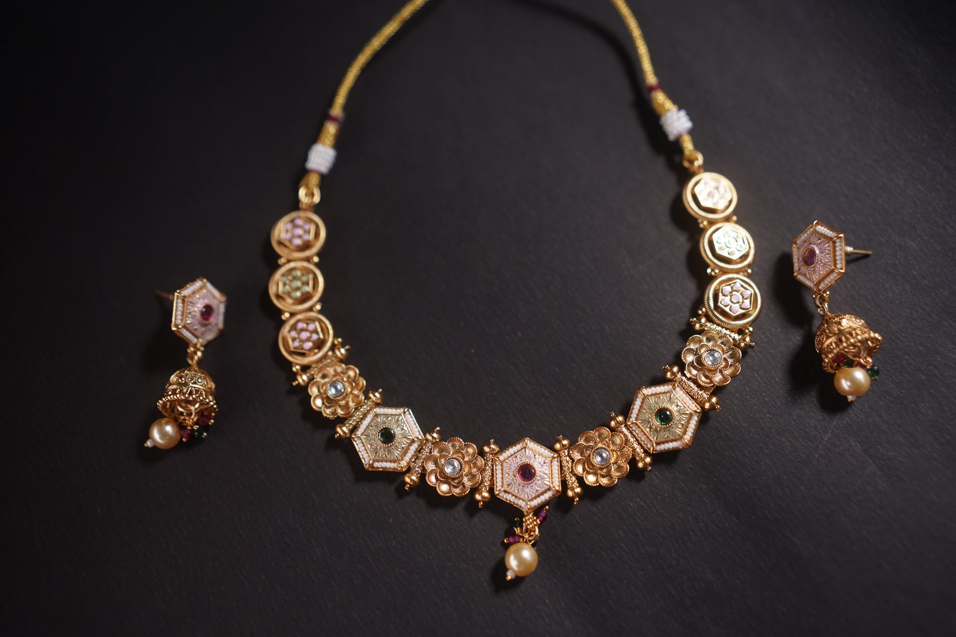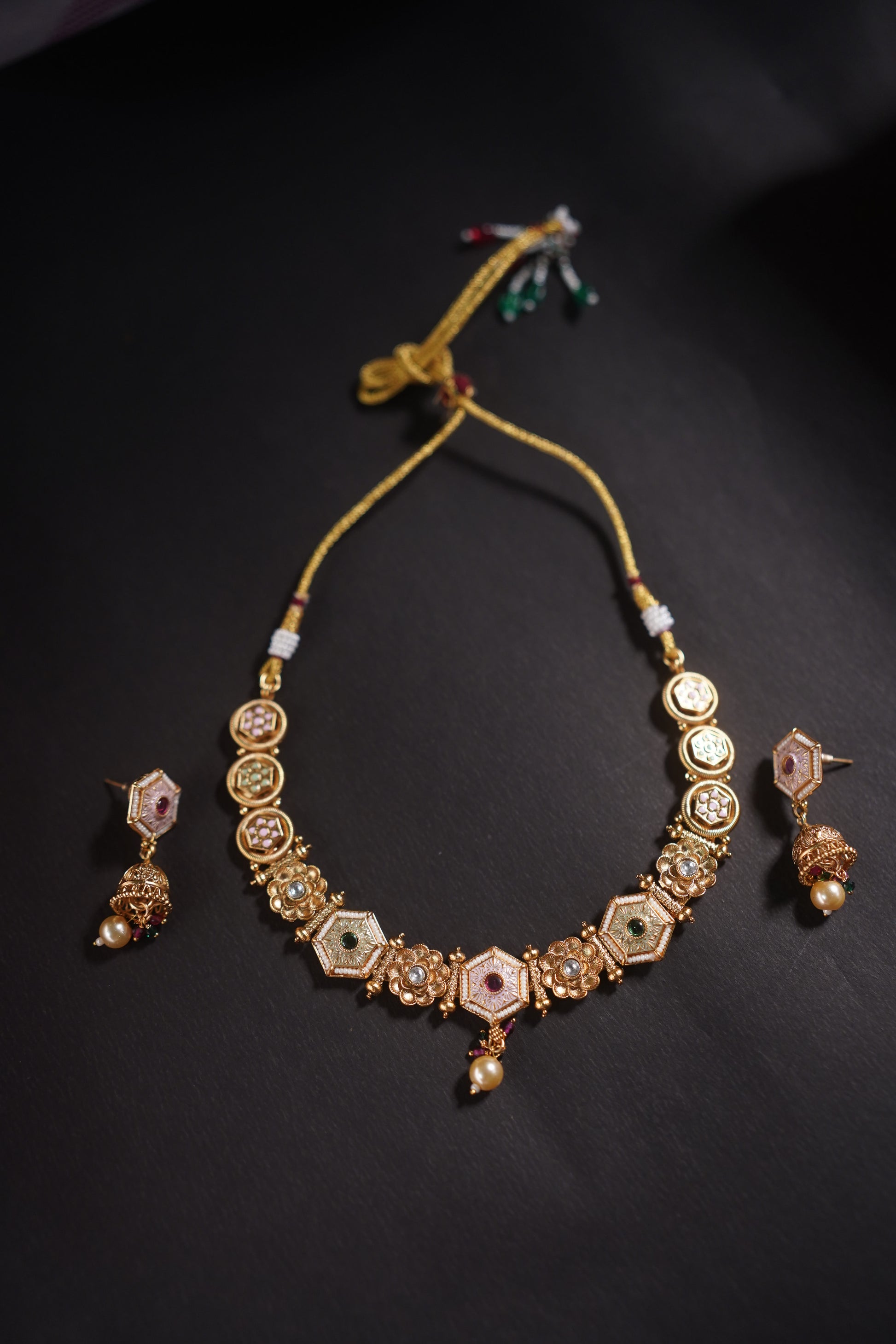 Step into the grandeur of ancient royal courts with the Gothica Naayika Noire Antique Necklace Set. Crafted with intricate antique gold plating, kundan-style stones, miniature motifs, and delicate pearl drops, this necklace set celebrates the opulence of traditional temple jewelry. A perfect blend of history and elegance, this set is designed for women who cherish heritage with a modern soul.