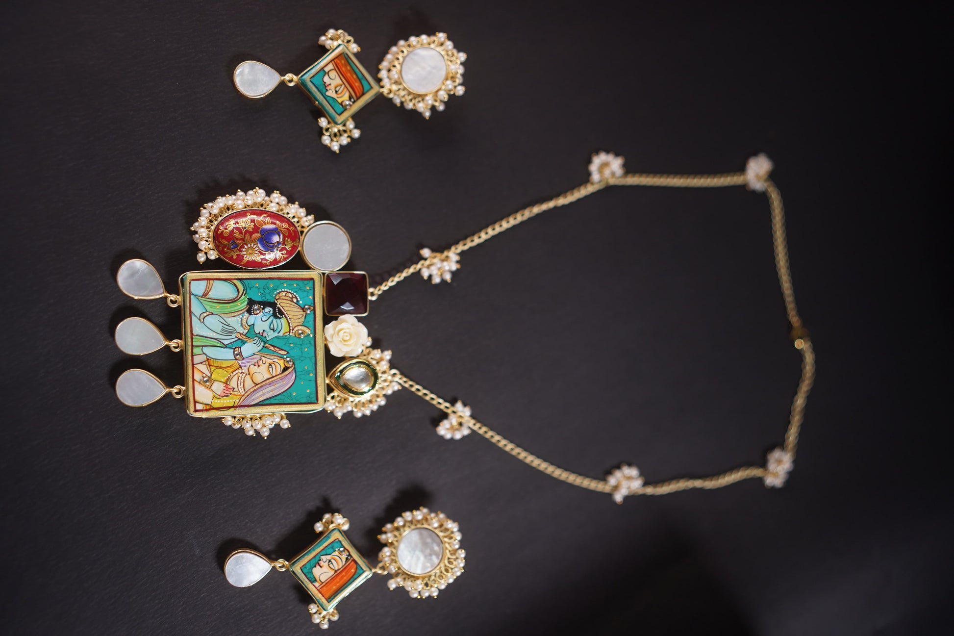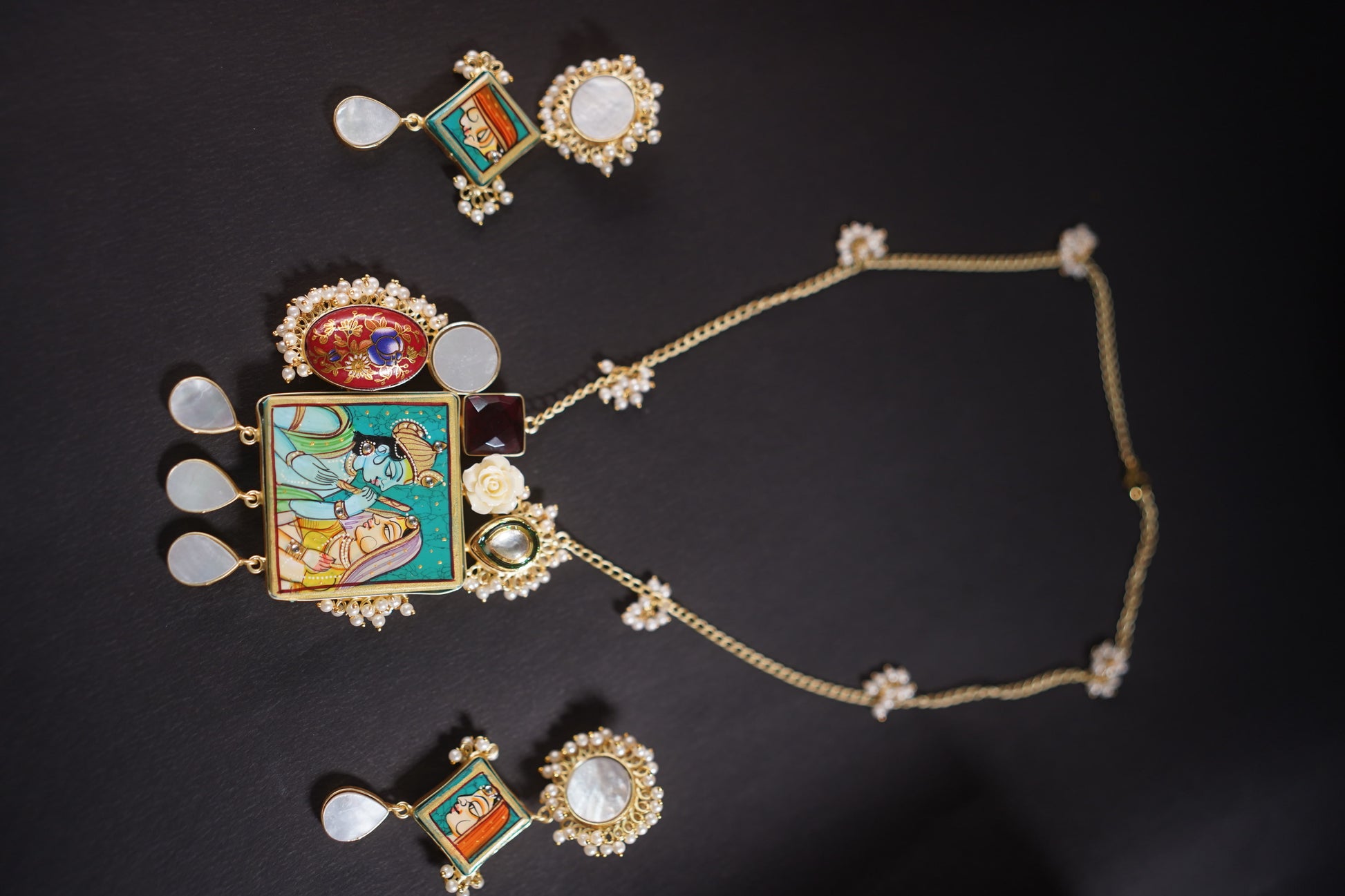 Step into a world where royal love stories are whispered through timeless art. The Roopkatha Handmade Necklace Set is a true testament to India’s rich artistic heritage, featuring intricate hand-painted portraits of a Radha and Krishna delicately encased within vintage-inspired frames.
