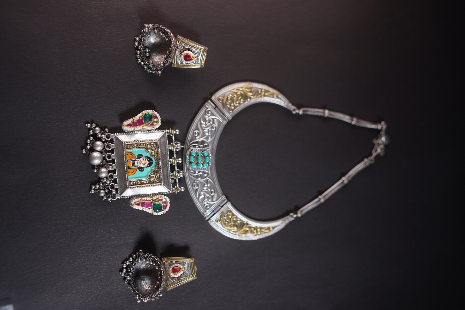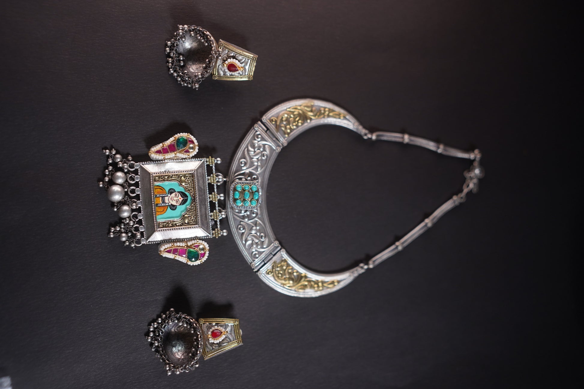 Gothica Roopkatha Handmade Statement Hasli Necklace set with Jhumkis with Meena work and dual tone