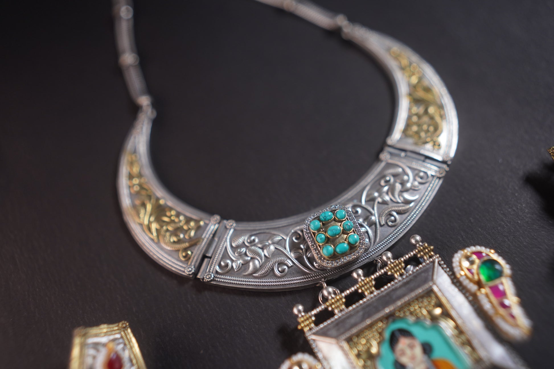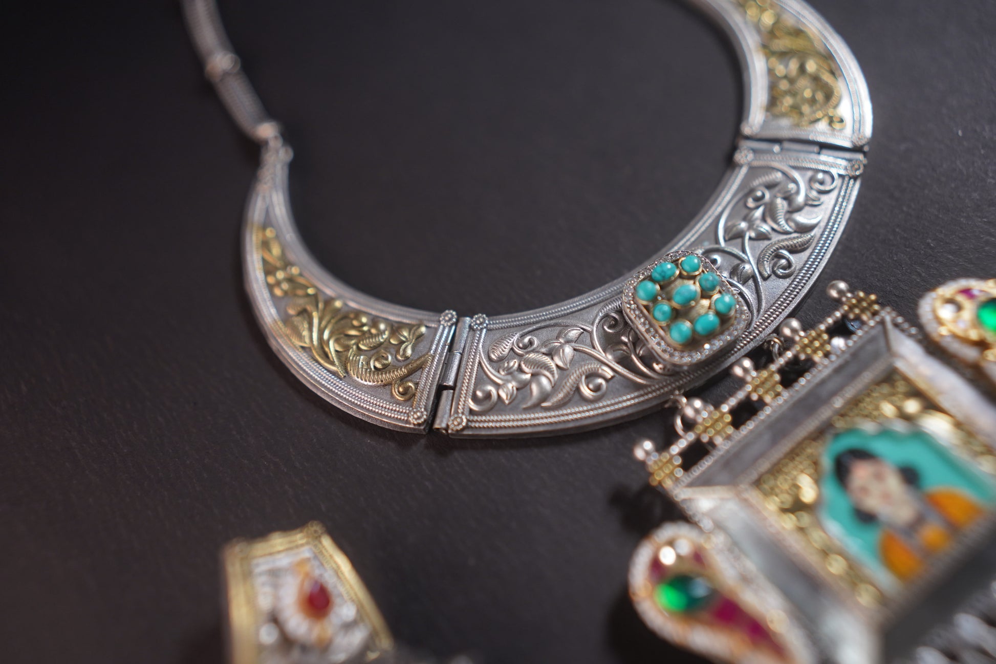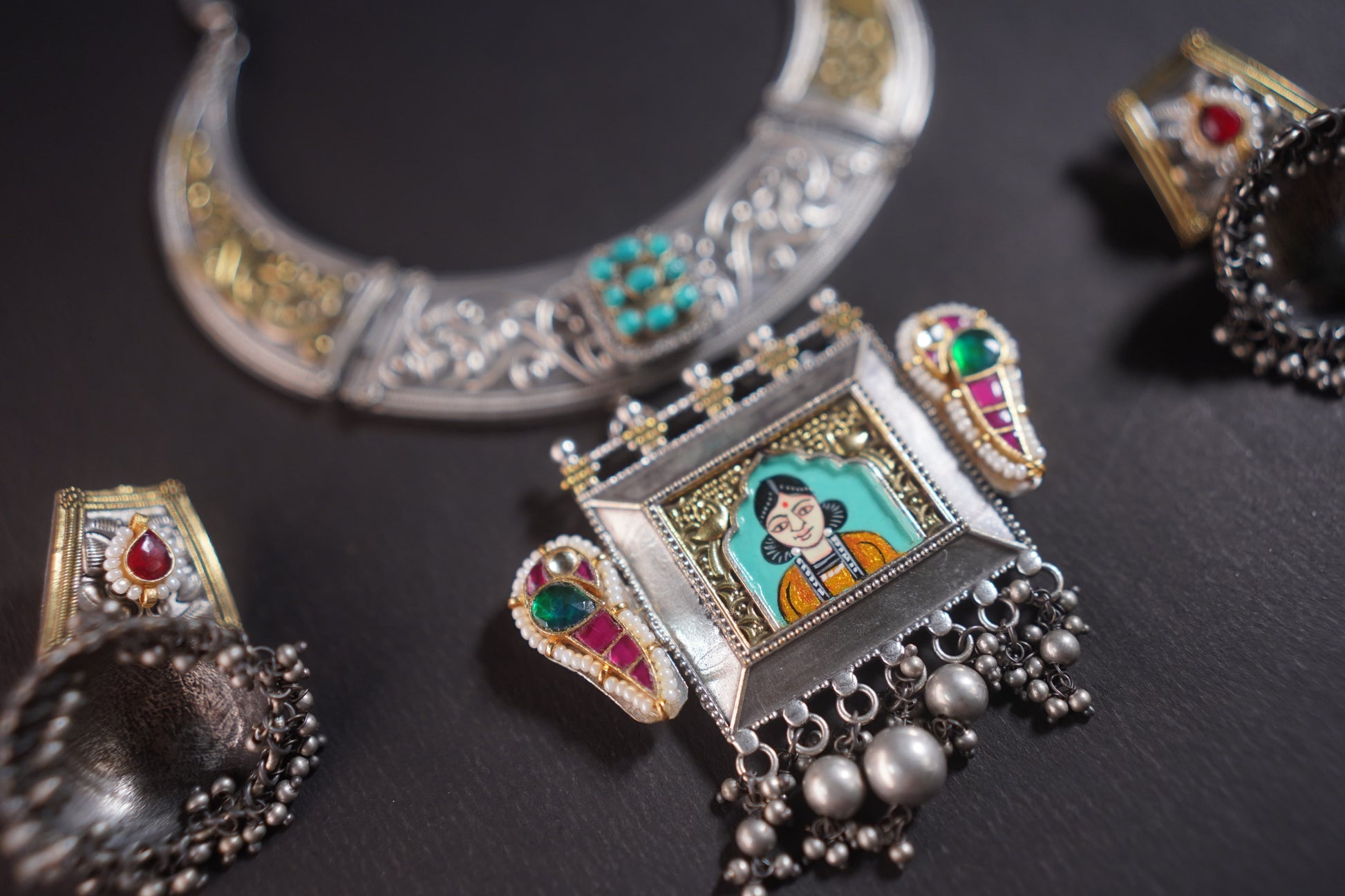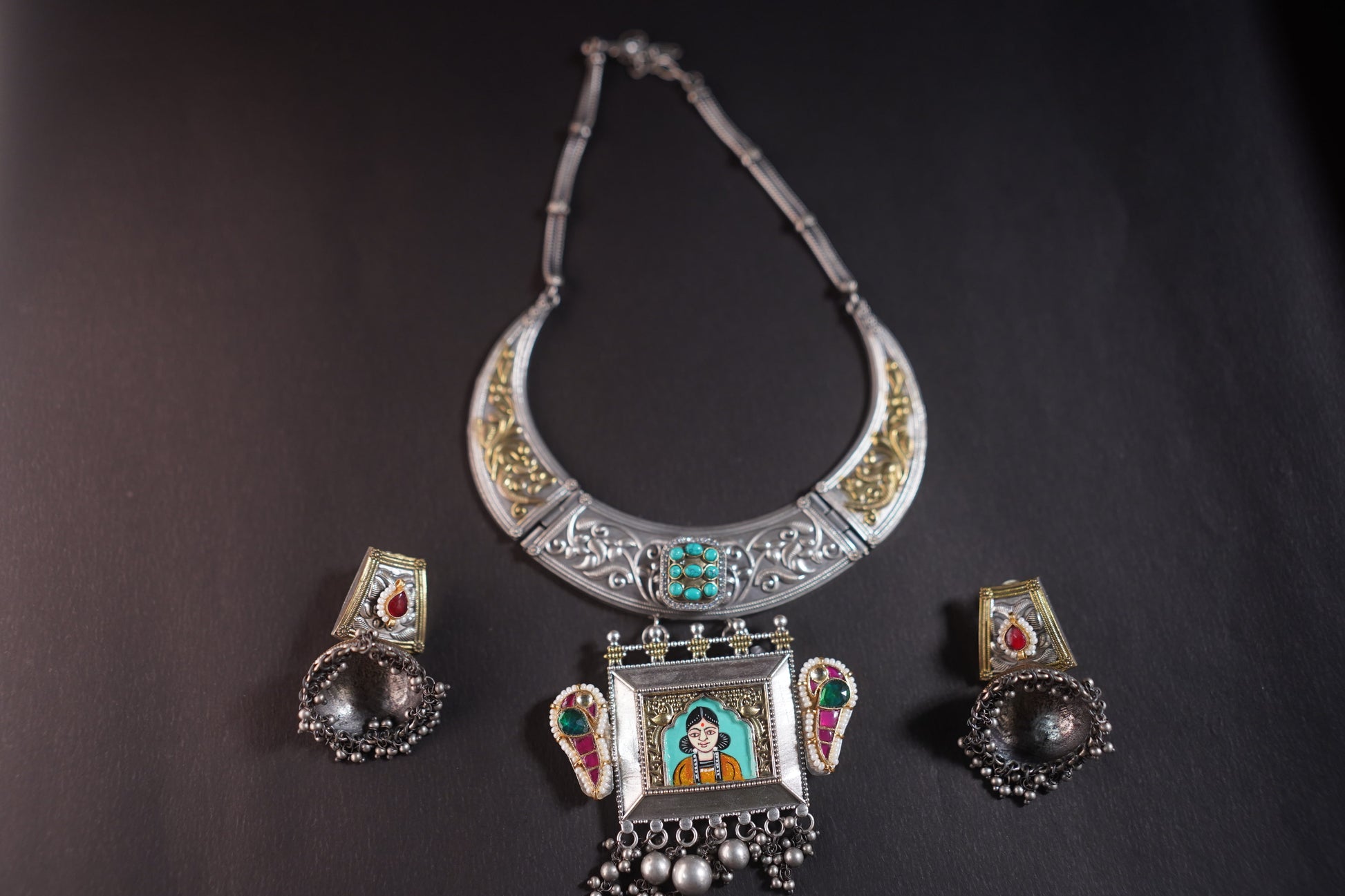 Gothica’s Heirloom Muse is a handcrafted statement Hasli necklace that echoes the splendor of royal courts and forgotten heirlooms. Featuring a delicately hand-painted miniature portrait of a regal muse, set against oxidized silver, antique gold accents, turquoise stones, and tribal bead drops, this piece embodies gothic heritage artistry.