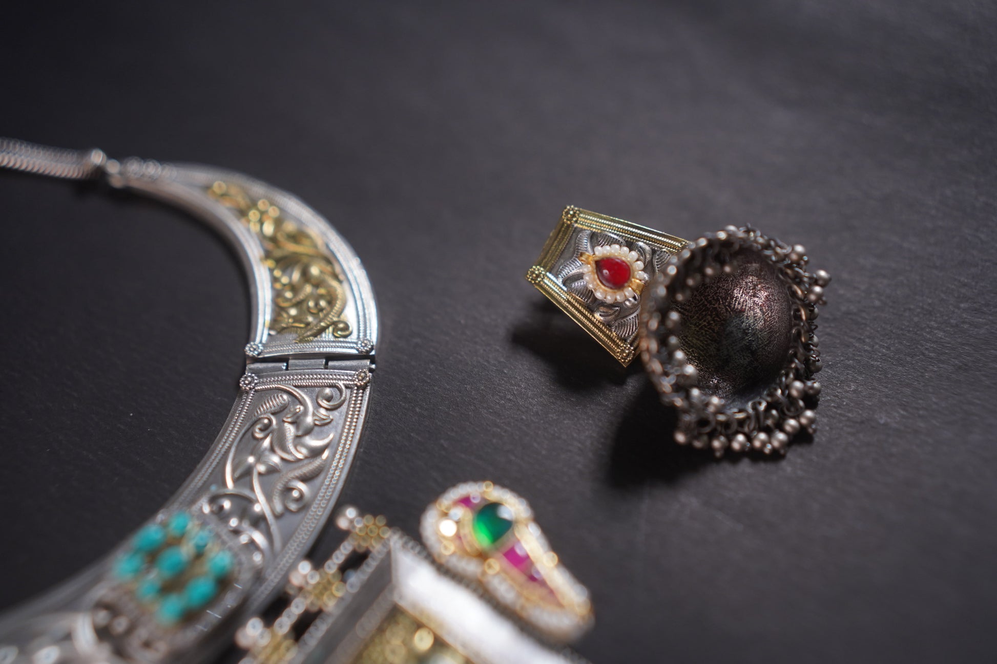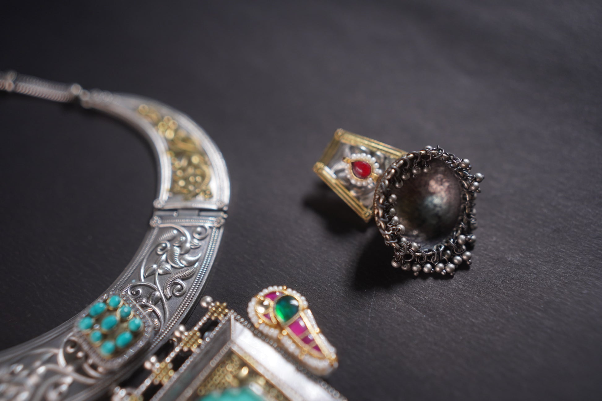 Avoid heavy earrings — opt for tiny studs or none at all. Let the Hasli take center stage. Complete the look with the accompanying oxidized rings. -